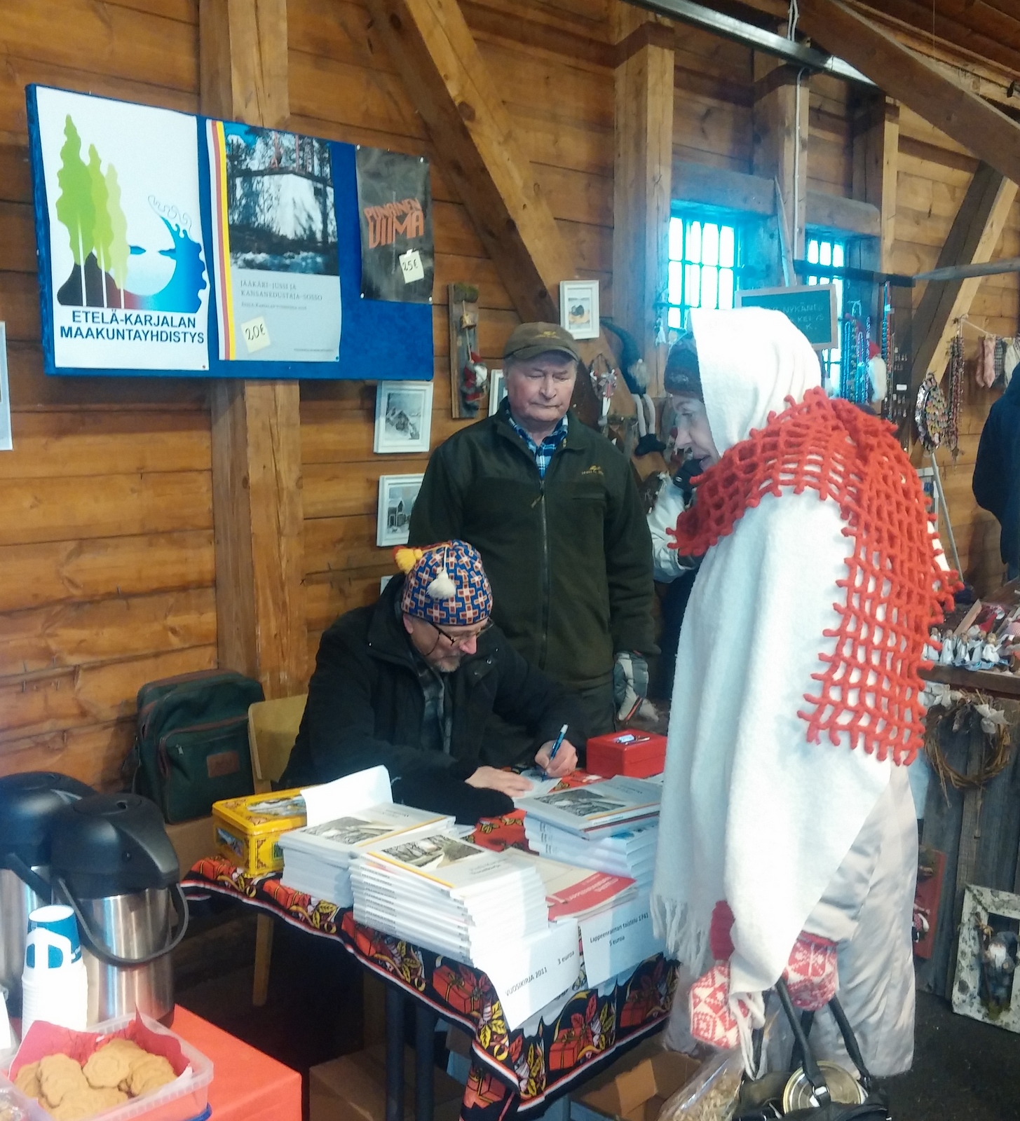 Yhdistyksen ”myyntitykki” Eero Kaasalainen on jälleen saanut yhdistyksen kirjan kaupaksi Linnoituksen joulutorilla v. 2016. Antti Vanhanen, yksi kirjan kirjoittajista, pyyhkäisemässä nimikirjoitustaan teoksen alkusivulle.